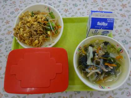 【こんだて】 ごはん きりぼしだいこんいりビビンバ ぎゅうにゅう わかめスープ