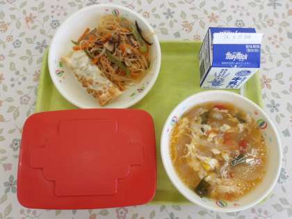 【こんだて】 ごはん ぎゅうにゅう ぼうぎょうざ はるさめのカラフルいため たまごとトマトのちゅうかスープ