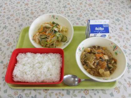 【こんだて】 ごはん ぎゅうにゅう しせんふうマーボーどうふ バンサンスー