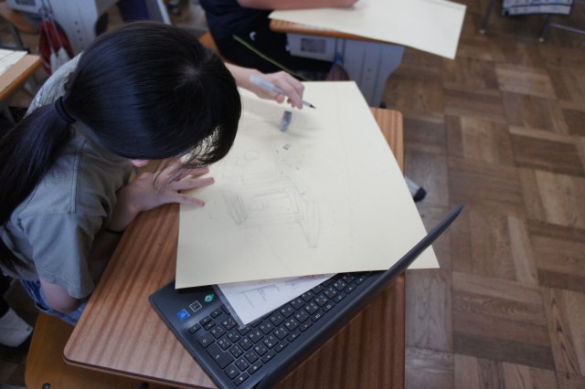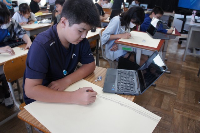 6年生の図工の学習では、「わたしの大切な風景」というテーマで、絵画制作に取り組んでいます。今日は、その第一歩として、タブレットを使って実際に校舎の写真を撮り、その写真をもとに下書きをしました。子供たちが6年間通った校舎には、一人ひとりたくさんの思い出があります。「運動会で応援した校庭」「毎日通った昇降口や教室」など、心に残っている場所がたくさんあります。子供たちは自分の思いをイメージしながら描き始めました。下書きの段階では、建物の形をよく観察して、窓や屋根の位置を丁寧に確かめ、細かい部分まで一生懸命描き進める姿が見られました。これから色をつけていくと、さらに自分らしい「大切な風景」に仕上がっていきます。完成がとても楽しみです。