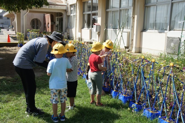 1年生が春から大切に育ててきた朝顔が、夏には色とりどりの花を咲かせ、子供たちの目を楽しませてくれました。毎朝水やりをしたり、花の数を数えたりしながら、朝顔の生長を観察してきました。花が終わると、ふくらんだ実ができ、その中に黒くつやつやした種が入っていることを知りました。実をそっと開けてみると種が出てきて、子供たちは「ほんとに入ってる!」「来年もこれで育てられるんだね」と目を輝かせていました。一つの花からいくつも種が取れること、来年また花を咲かせられることを知り、自然の不思議さや命のつながりを実感したようです。