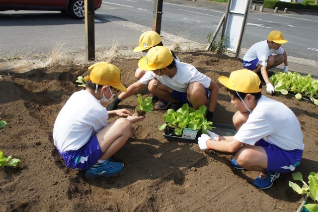 9月18日(木) 6年生が地域の方のご協力を得ながら、本校近くの畑で白菜の苗植えと大根の種まきをしました。苗を植えるときには、根がしっかり土に根付く井ように、丁寧に手で土をかけました。大根の種は、小さな粒を一つひとつまいていきました。とても小さな種なので、落とさないように気を付けながら作業をしました。畑に並んだ苗や種を見ると、これからぐんぐん育っていく姿が待ち遠しいです。収穫の日には、大きく育った白菜や大根を目の前にした子供たちの表情がとても楽しみです。