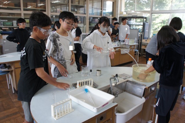 6年生の理科では、「炭酸水には何がとけているか」という実験を行いました。炭酸水をコップに注ぐと、シュワシュワと泡が出てきます。この泡の正体を調べるために、サイエンスサポーターの先生にサポートしていただきながら実験を進めました。炭酸水から出てくる気体を石灰水に通すと、石灰水が白くにごりました。この結果から、炭酸水には二酸化炭素がとけていることがわかりました。今回の学習を通して、子供たちは身近な現象にも理科の知識が活かせることを実感しました。これからも身のまわりの「なぜ?」「ふしぎ」を大切にしながら学びを深めていきたいと思います。