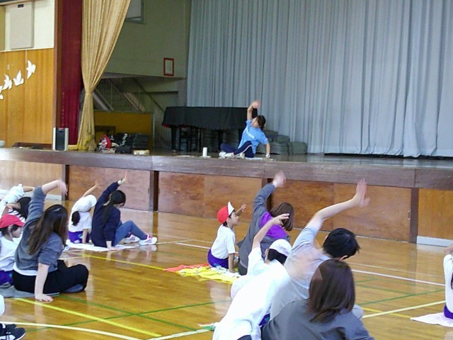 2年生の親子学習会で、エアロビクス体験を行いました。講師の先生をお招きして、音楽に合わせて体を動かしながら、親子で楽しく運動しました。始めは少し緊張していた子供たちも、先生の明るい声かけとリズミカルな音楽に合わせて、だんだん笑顔になっていきました。お家の方と手をつないで動いたり、ジャンプしたりして、会場は笑い声でいっぱいになりました。今回の親子学習会を通して、運動の楽しさや、親子で協力することの大切さを改めて感じていたようです。これからも、みんなで元気に体を動かしていきたいと思います。
