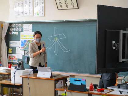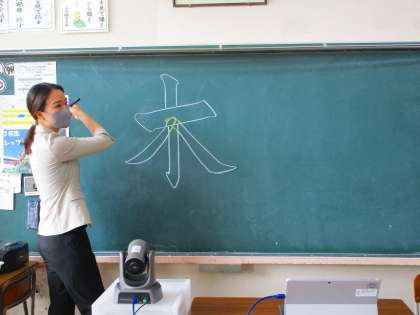 先生は、画面越しの子供たちの様子を確認しながら、「木」の文字の筆の「とめ・はらい」を丁寧にご指導してくれました。