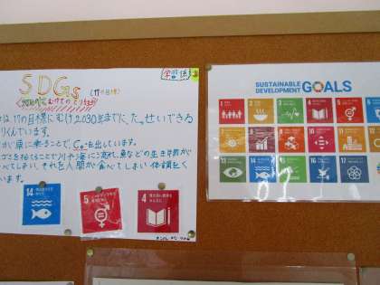 SDGs研究員の子供たちを中心に「残菜を減らそう」「使わない教室(部屋)の電気を消そう」「持ち物に名前を書こう」「話をよく聞こう」など前期に実践してきました。