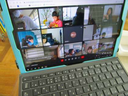 ※写真は、先生が見えている画面と、預かり登校できている児童の作業の様子です。