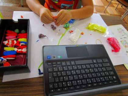子供たちの想像力には驚かされます。自分の好きな食べ物を、見事に再現しています!2色・3色の粘土を混ぜて色を作って、色とりどりの「ごちそう」を作りました。