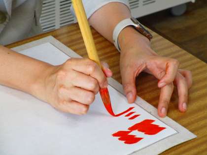 今日は小筆の使い方を教えていただきました。筆の持ち方で書きにくくなったり、くっついてしまったりすることを実演していただきました。