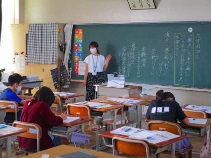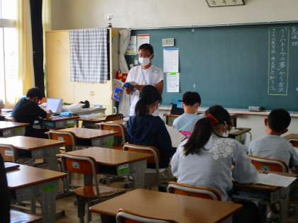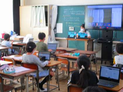 ハイブリット式の学習は、分散登校で学校に来ている児童と、自宅学習の児童がオンラインで一緒に授業を受けてる試みです。