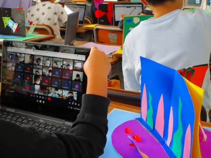 分散登校期間中は、一部ハイブリッド型の授業を行っています。