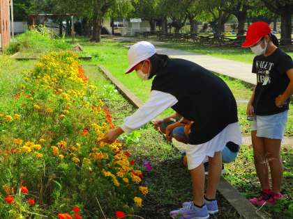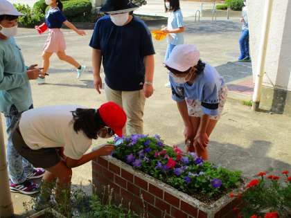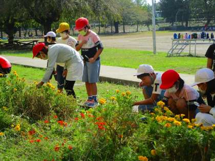 一人一人「虫眼鏡」を手に、マリーゴールドやペチュニアを観察していました。子供たちがクラス揃って、教室の他に体育館や運動場で学習している姿が見られて嬉しいです。