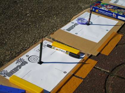3年生が理科「地面の様子と太陽」の学習で、1時間おきに太陽の動きを観察する準備を行っていました。早速、1時間経ったときに、記録をしにいそいそと自分の観察板に記録をして教室に戻っていました。
