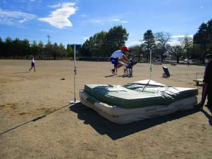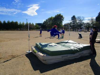 6年生が陸上の練習を行っていました。高跳びの恐怖感をなくすために、今日はマットは2枚重ね、バーのかわりに平ゴムを使用して、歩数や踏切の足の位置などを確認しながら、"跳ぶ”練習をしていました。
