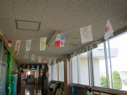 そのお礼に、5年生は6年生の「校内陸上記録会」を応援する万国旗を廊下に飾ってくれました。