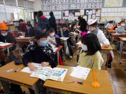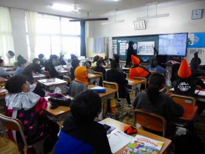 今日の5年生の学習は「Where is my treasure?」です。子供たちは、思い思いの仮装をしていますが、いつも通りにすすめました。最後に集合写真を撮って、記念にしました。
