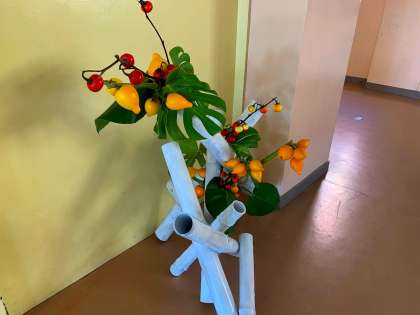 昨晩、久しぶりに西中根地区の重田充子様が来校され、玄関のオブジェを「秋」らしくアレンジしてくださいました。