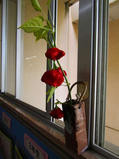 照沼先生が「ご近所さんからいただんです。子供たちにも見せたいので、花瓶に生けますね!」と、校長室前廊下と職員玄関に生けてくれました。