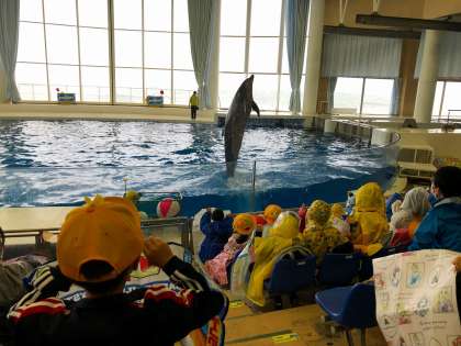イルカショーでは、濡れそうで濡れない距離でしたが、ジャンプで出た大きな水しぶきに歓声が上がりました。