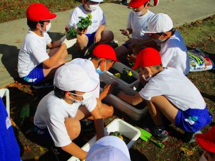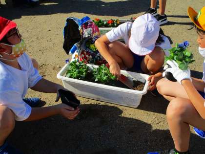 今日は、お花屋さんから花の苗が届き、4年生全員でプランターに植え替えてくれました。