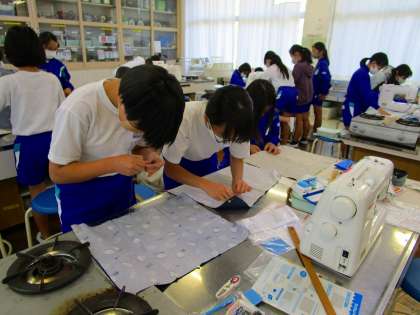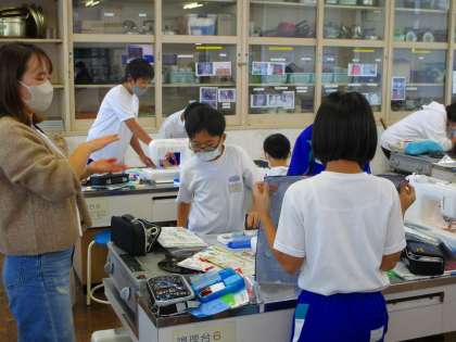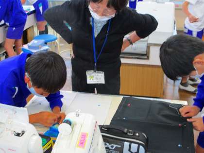 5年生の家庭科の授業で、ミシン使って、ナップザックづくりがスターとしています。