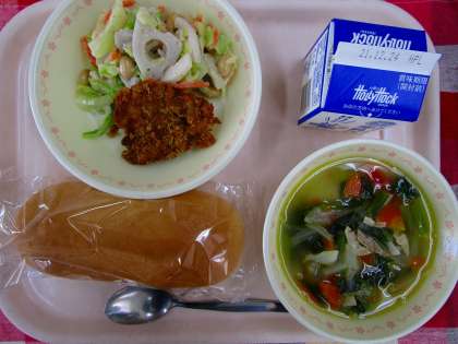 今日は県の事業「つくろう料理コンテスト」で最優秀賞を受賞した6年1組の植田史也さんが考えた献立の中から「具だくさん!栄養満点スープ」を出しました。茨城県のおいしい食材をたっぷり使った,栄養もたっぷりのスープです。食材のうま味を楽しんで下さい。