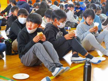 「めざせ★お米マイスターをめざせ!」の活動報告のあと、5年生が田植えをし、海野農園様に収穫していただいた長堀米の試食をしました。