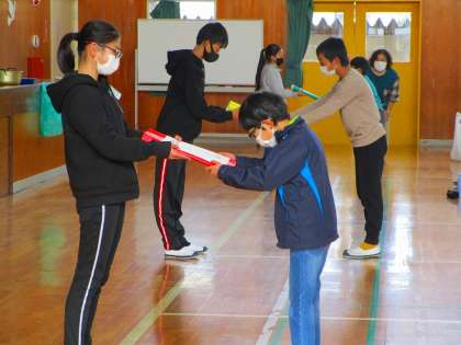 6年生は収穫祭に招待してもらった御礼として手作りの「Bookカバー」を5年生にプレゼントしました。最後に校長先生から労いの言葉をいただき、小規模ではありましたが、充実した「長堀マイスター☆収穫祭」を終えることができました。