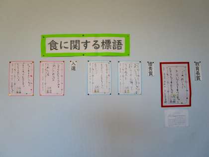 今年度、「つくろう料理コンテスト」「食に関する標語」に本校児童が応募し、賞に入った作品が市役所に掲示されていました。その掲示物を今日から学校に掲示しています。