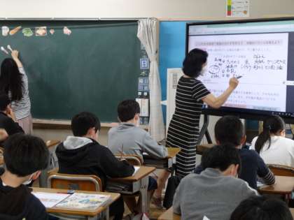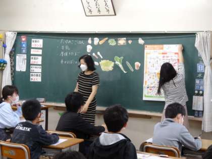 6年生の家庭科の授業では、「朝食から健康な一日の生活を」の学習をしています。朝食の役割や、バランスのよい食事について学習しています。授業は、担任と栄養教諭のT・Tで実施しています。