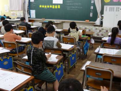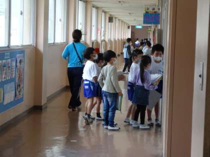 今日まで、1年生と2年生の学校探検が行われました。お兄さん、お姉さんになった2年生が、1年生を案内してくれました。「ここは、会議室だよ。中には、入らないでここから見てね。」など、上手に案内してくれています。教室にもどってから、1年生は、うれしそうに、2年生からもらった、名刺カードと、学校内の地図をノートに貼る姿が見られました。2年生のおかげで、校内の様子がよくわかりましたね。