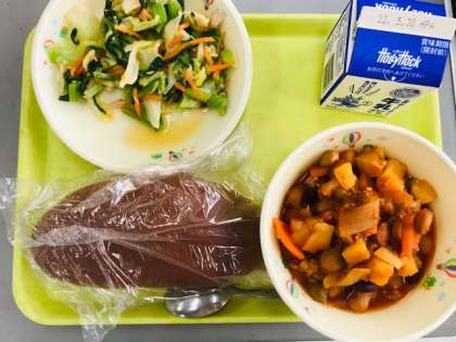 今日の給食は、くろパン、牛乳、チリビーンズ、オンオンドレッシングサラダ です。くろパンが、メニューに入っていることは少ないため、子供たちはよく味わって食べていました。また、野菜がちょっと苦手でも、オンオンドレッシングのときは、食べることができる子もいるようです。