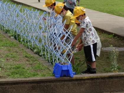 1年生が育てているアサガオがぐんぐんと育ってきました。一人一人の植木鉢には支柱がたてられました。もう少しすると、つるがのびて支柱をつたってもっともっと伸びることでしょう。また、4年生では、総合的な学習の時間でグリーンカーテンをつくっています。今日も実行委員の児童が休み時間にお世話をしてくれていました。今年も立派なグリーンカーテンができるといいですね。