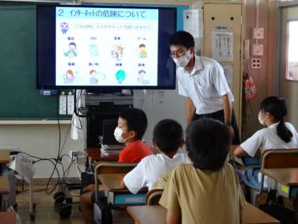 5年生では、茨城県警少年サポートセンターから講師の先生を招いて、ネットトラブル防止教室を行いました。SNSやインターネットを使用するうえで、どんなことに気をつけなければならないか、具体的なお話をいただきました。注意していないと様々な犯罪に巻き込まれてしまうことから、子供たちも真剣な表情でお話を聞いていました。また、今日の活動は、3つの教室をオンラインでつないで実施しました。