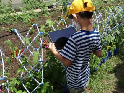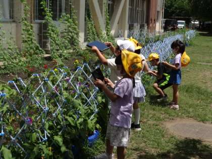 1年生が育てているアサガオがたくさん花を咲かせています。今日は、タブレットパソコンを使って、花の様子やつぼみの様子を写真に撮りました。タブレットパソコンを使うと、小さなものも、大きく拡大して見ることができます。
