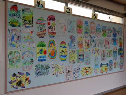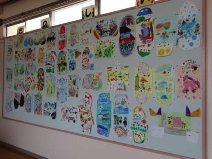 プレイルームの前の掲示コーナーには、今、2年生の図工の作品が飾られています。作品名は、「ふしぎなたまご」です。色鮮やかに塗られたたまごが割れて、子供たちが考えた様々なものがうまれてきます。子供たちの想像力に驚かされます。