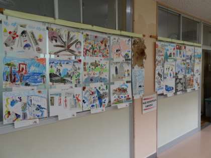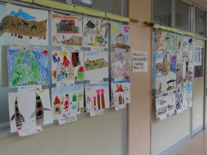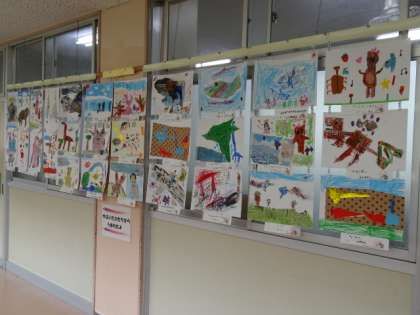 1年生の廊下には、図工で作った作品が飾られています。作品名は、「やぶいたかたちから、うまれたよ。」です。新聞紙などの紙をやぶって、偶然できた形から、いろいろな動物や乗り物などを、思い思いに描いていきました。やぶいたかたちから、いろんなものがうまれました。