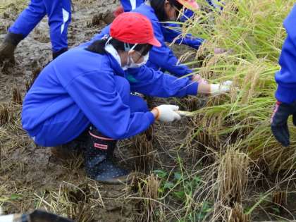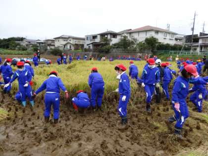 今日は、5年生が稲刈りを行いました。春に田植えをした稲もすっかり実り、収穫の時期を迎えました。地域の海野農園の方々、保護者のボランティアの方々のご協力をいたただき、5年生のみんなで稲を刈りました。昨年までの2年間、コロナの影響で思うように田植えや稲刈りが、子供たちの手でできませんでした。しかし、今年は3年ぶりに子供たちの手で、田植えと稲刈りの両方を行うことができました。きっと、おいしいお米が収穫できたことでしょう。