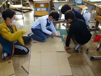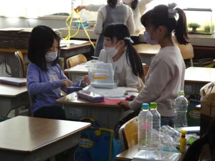 2年生の図工では、おもちゃ作りをしています。空き箱や段ボールなど、集めた材料を使って遊べるおもちゃを作っています。友達と相談したり、工夫したりしています。どんなおもちゃができるか、楽しみですね。