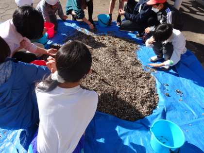 6年生が、育てていたひまわりの種を青空農園から、収穫してきました。しばらく太陽の下で干した後に、一つ一つ花からほぐしていきました。すると、たくさんの種をとることができました。この種をこのあと、どんな活動につなげていくか、楽しみです。