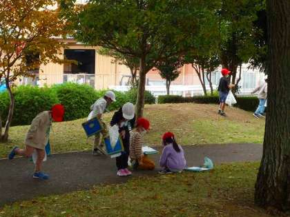 今日は、1年生が中根公園に公園探検に行ってきました。公園では、どんぐりを見つけたり落ち葉や木々を観察したりと、それぞれに「おもしろいな」と感じたものに、足を止めていました。