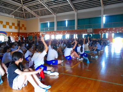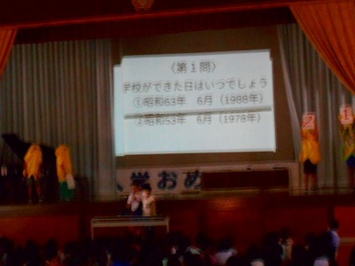 ハッピーバースデー集会 公開日 2023/06/26 更新日 2023/06/26 校内行事 26日(月)、『ハッピーバースデー集会』を行いました。 計画委員会が活動内容を考え、歴史紹介や3択クイズをしました。みんなが大好きなクローバー君(キャラクター)は、2001年に誕生したそうです。最後に、校歌斉唱。久しぶりに全校児童の歌声が、体育館いっぱいに響きわたりました。