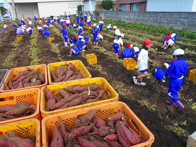 今年のさつまいもも大豊作で、コンテナ101ケース、およそ2トンの収穫量になりました。収穫したさつまいもは、全児童が持ち帰ります。ご家庭でも、「秋の実り」についてお話しいただけると幸いです。