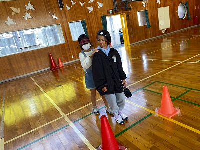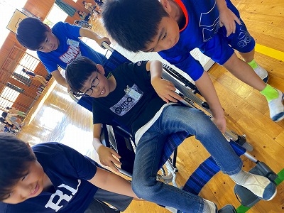 19日(木)、4年生は「車いす・アイマスク体験」を実施しました。初めての体験で、子供たちはワクワク・ドキドキしているようすでした。しかし、いざ、車いすに乗ったり、アイマスクを付けたりすると、そのようすが一変。歩くときとは違うスピード感や目が見えない怖さを強く感じていました。だからこそ、「動くよ」「段差があるからね」といった声が優しく安心することを再確認することができました。