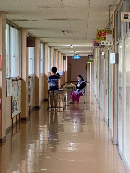 今日は視力検査(4.5年生)がありました。ソーシャルディスタンスを確保する工夫を鵜沼養護教諭が実践しています。