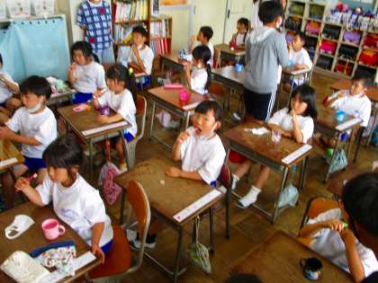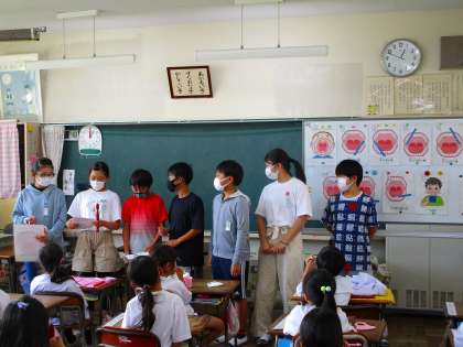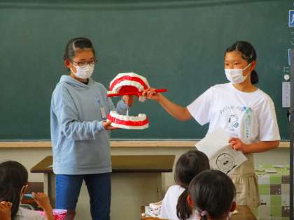 保健委員会の児童が、1年1組で歯磨き指導を行いました。