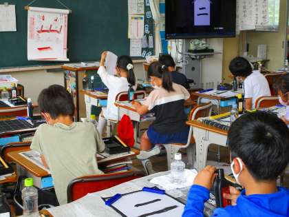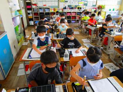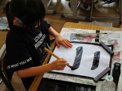3年生は、新しい学習がたくさん入ってきます。「書写」の授業で毛筆が始まっています。すでに何時間か学習しているので、子供たちは筆使いも慣れてきました。