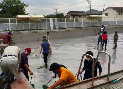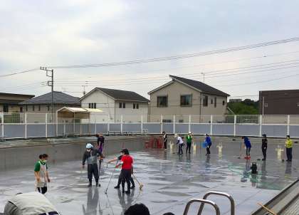 2年振りの水泳学習に向けて、昨日から戸塚校務員さんの協力を得てプール清掃を開始しました。2日目の今日は、午前中は中島校長先生と戸塚校務員さんで、プールサイドを中心に清掃。子供たちが下校した後は、全職員でプール内をピカピカに洗い上げました。ステンレス製のプールなのでピカピカが際立っています!