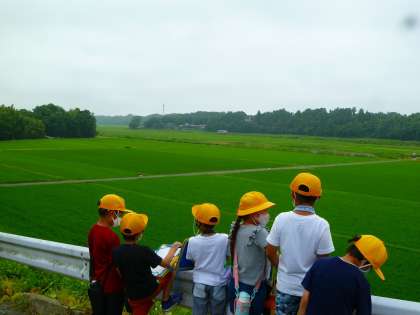 2年生が通学路や町の様子から、動植物の変化や人々のくらしの中に初夏の様子を見付け、親しむことをねらった探検。子供たちは、自分の住まいとは違うコースを選択したので、色々なものを発見しては、喜んでメモをとっていました。