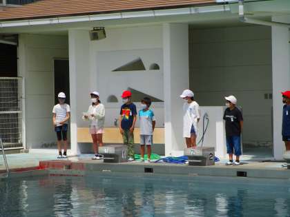 体育委員会の児童によるプール開きを行いました。水による事故がなく安全に水泳学習ができるように願って、5年生・6年生の代表児童が「抱負」を述べてくれました。